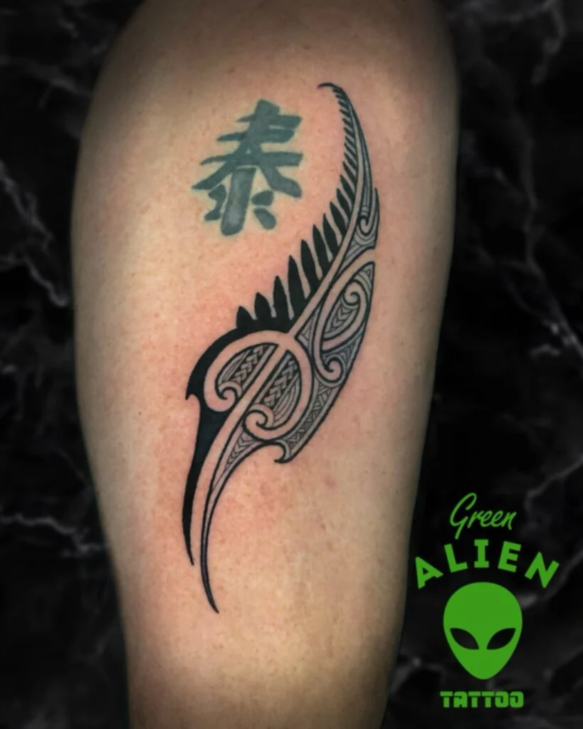 This unique tattoo combines the beauty of a fern leaf with tribal-inspired patterns, blending nature with cultural artistry. The bold, flowing lines within the leaf structure create a captivating design that feels both powerful and artistic.