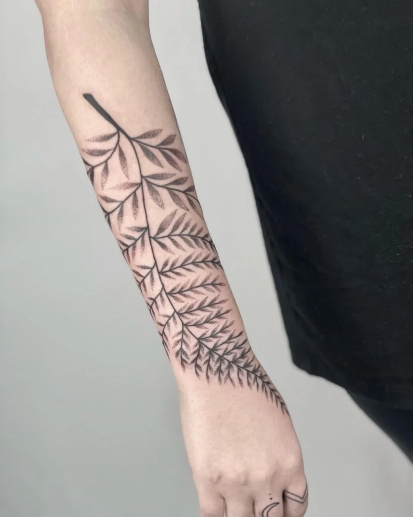 - Detailed fern leaves with fine shading look stunning on the forearm, thigh, or ribcage.