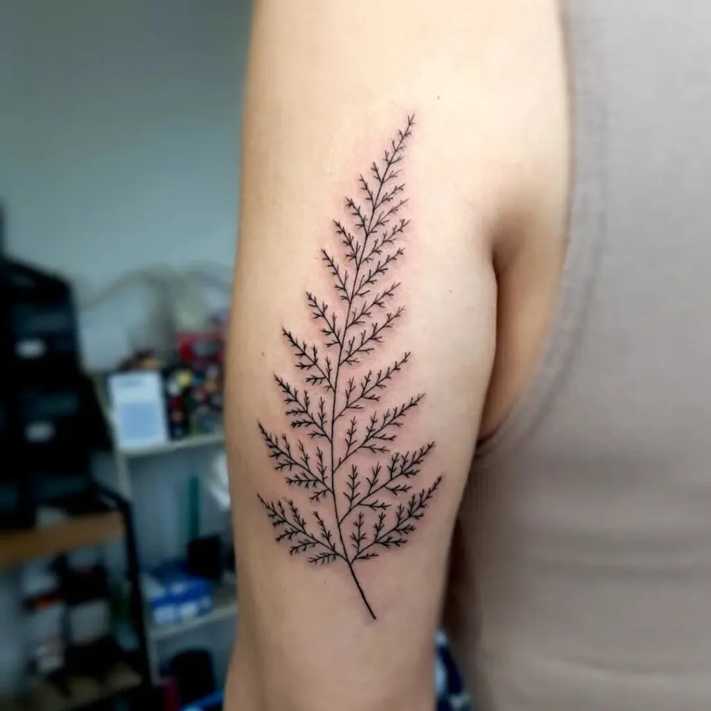This delicate fern tattoo sits gracefully on the upper arm, created with fine, precise lines that mimic the fragility of a real fern frond. Its light and airy structure conveys elegance, simplicity, and softness.