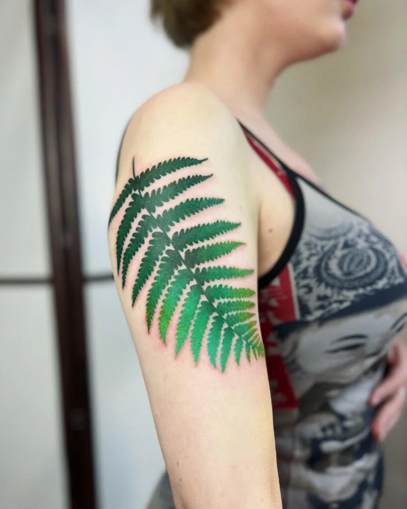 This shoulder tattoo captures the fern leaf in a highly realistic style, using varying shades of green to create depth and texture. Its bold presence makes it look as though a fresh fern is resting on the skin.