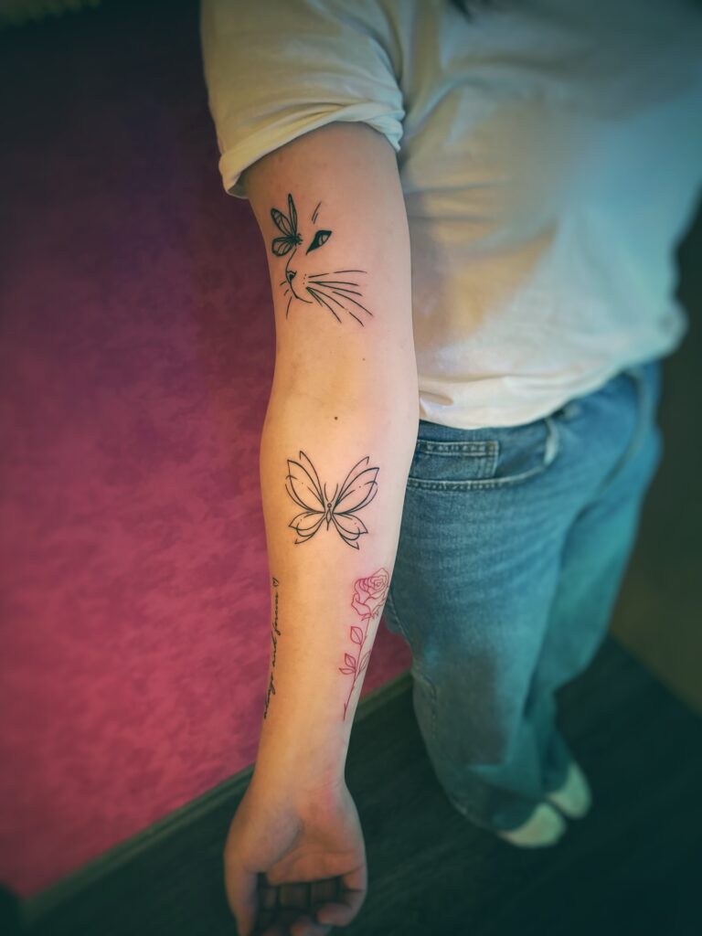 This playful forearm tattoo combines the minimal outline of a cat’s face with a butterfly resting on its nose. Below, a delicate butterfly and rose continue the theme, giving the piece a whimsical, story-like flow along the arm.