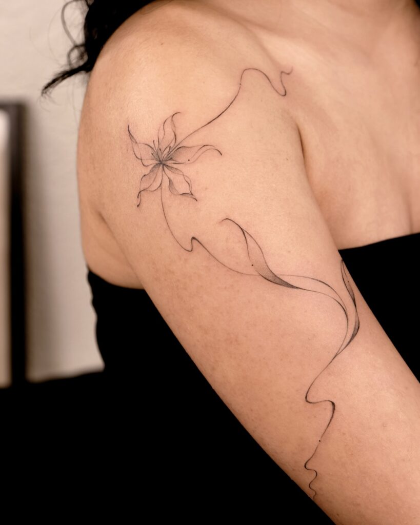 15. Flowing Shoulder Flower Fine Line Tattoo