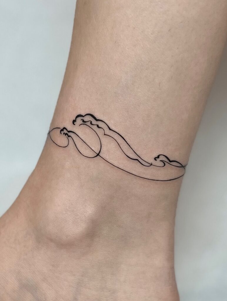 This ankle tattoo depicts ocean waves using a continuous single line, giving it a sleek and minimal aesthetic. The simple outline captures the natural rhythm of the sea without needing heavy shading or complex details.