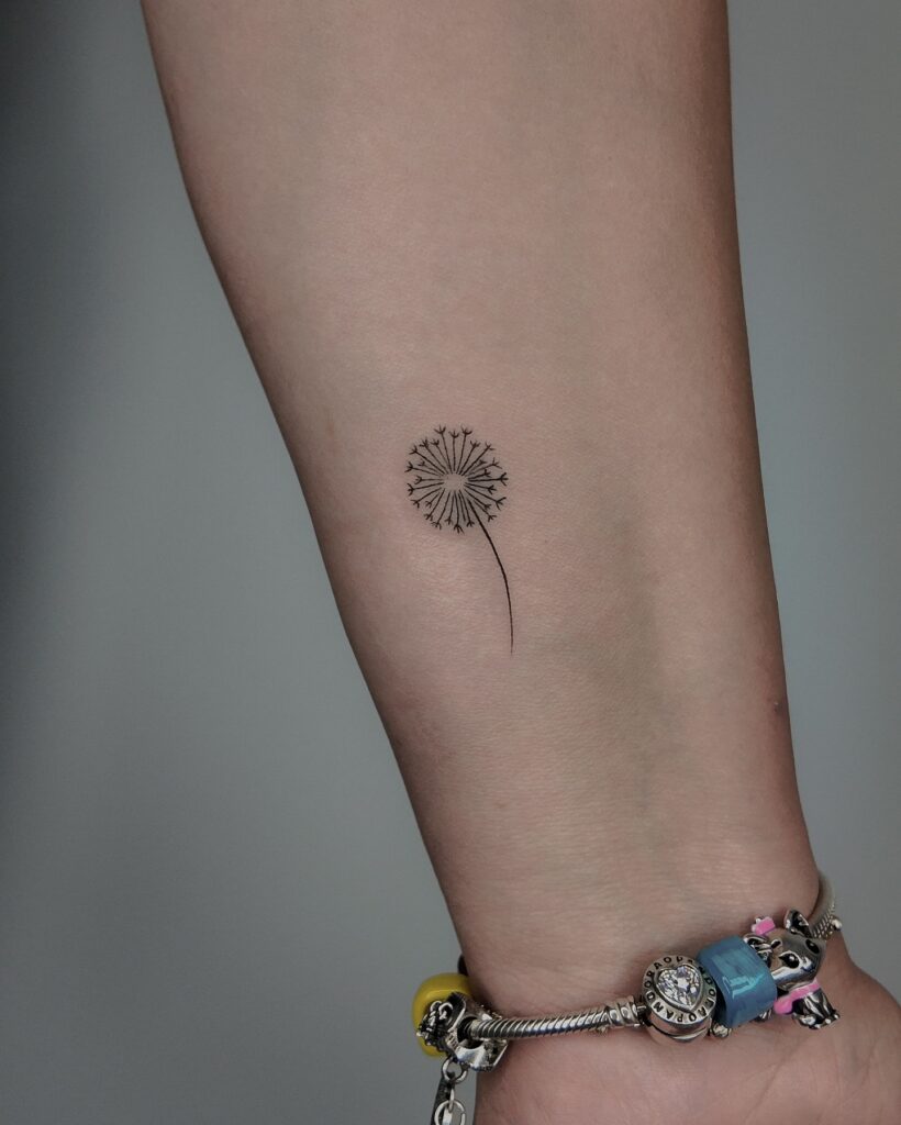 This delicate dandelion tattoo captures the fleeting beauty of wishes and freedom. Its fine, thin lines create a soft and graceful effect, making it a perfect choice for women who love understated yet meaningful designs. Placed on the forearm, it draws attention naturally without overwhelming the skin.