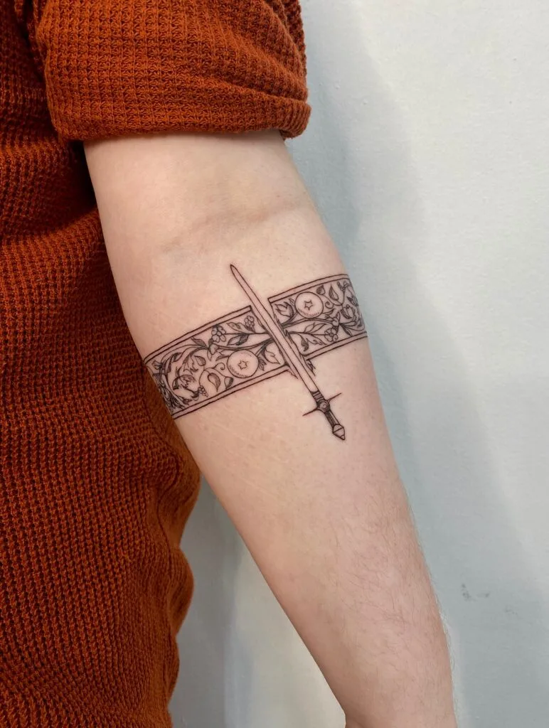 This forearm piece combines a vertical sword with an intricate ornamental band, executed in striking fine lines. The detailing within the band—featuring floral and geometric motifs—contrasts beautifully with the clean sword, creating a balance between strength and elegance.