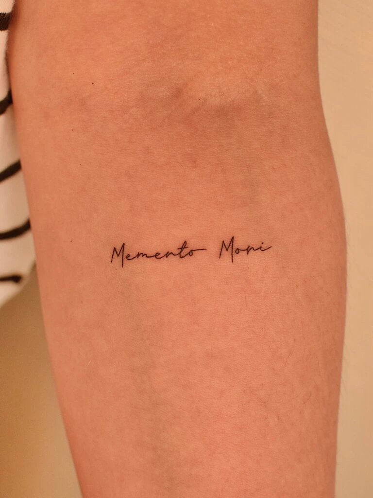 Written in elegant cursive, this fine line script tattoo carries the powerful Latin phrase “Memento Mori,” meaning “remember you will die.” Its simplicity enhances the weight of the message, making it a meaningful reminder about life’s fragility and the importance of living fully.