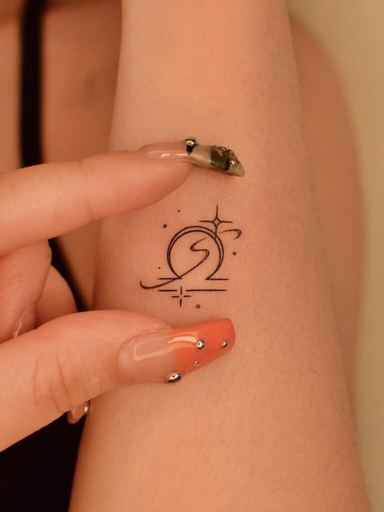 This small yet detailed tattoo represents the Libra zodiac sign, executed with sleek fine lines and subtle decorative stars. Its compact design makes it both elegant and versatile, suitable for discreet placement.