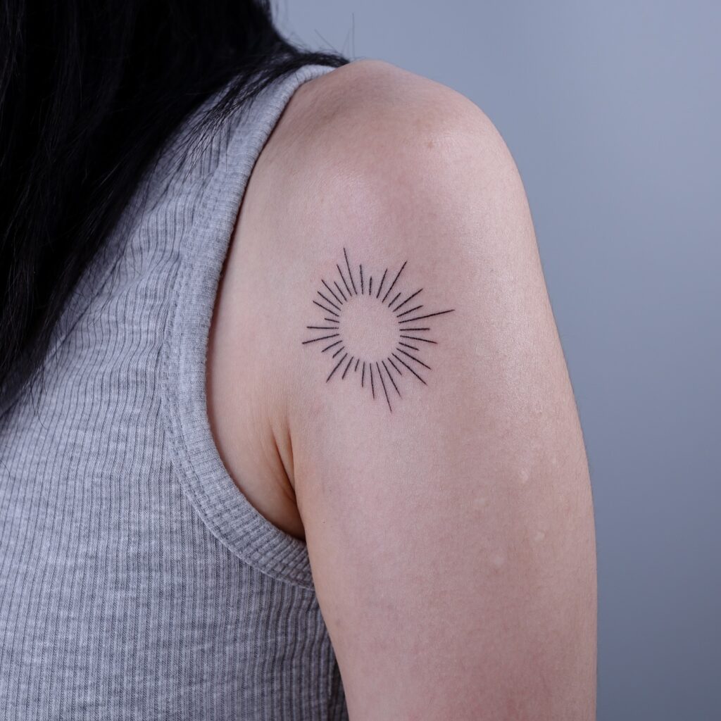 Placed on the shoulder, this fine line tattoo features a circle surrounded by evenly spaced rays, creating a radiant sun effect. Its symmetry and simplicity make it both modern and timeless.