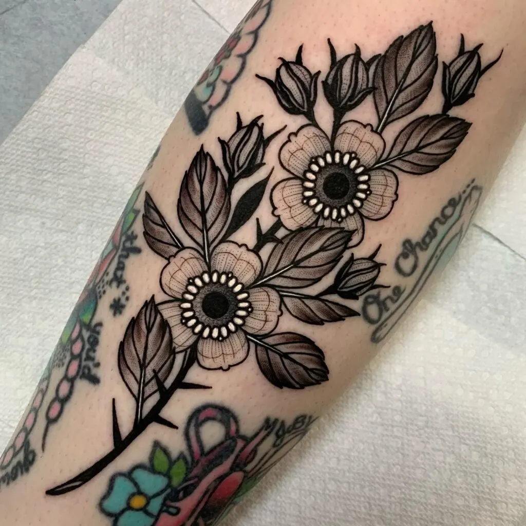 This floral tattoo is a striking blackwork design featuring bold flowers and leaves inked with high contrast shading. The piece carries a vintage botanical illustration style, with deep black outlines that make each petal and vein stand out. Positioned on the arm, it merges strength with natural beauty, symbolizing resilience and personal growth.