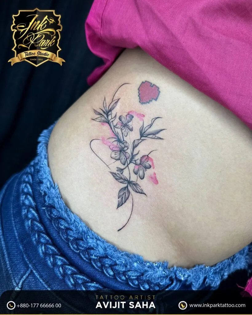 Placed gracefully on the side of the waist, this tattoo combines fine-line floral details with soft watercolor accents in pink. The flowers flow organically across the skin, creating a design that feels elegant and feminine. The light splashes of color add a painterly effect, making the tattoo appear soft and romantic.