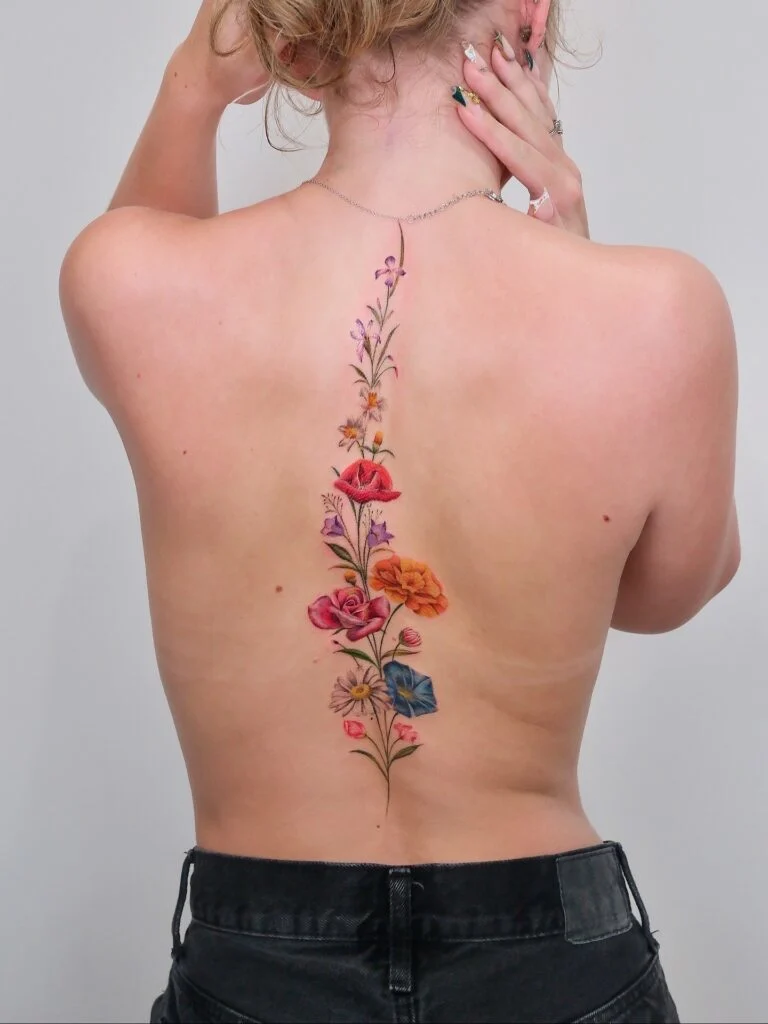 Running gracefully down the spine, this floral tattoo features a vertical arrangement of colorful flowers that enhance the natural symmetry of the body. From delicate daisies to bold roses, each bloom adds a unique symbol of growth, beauty, and individuality.