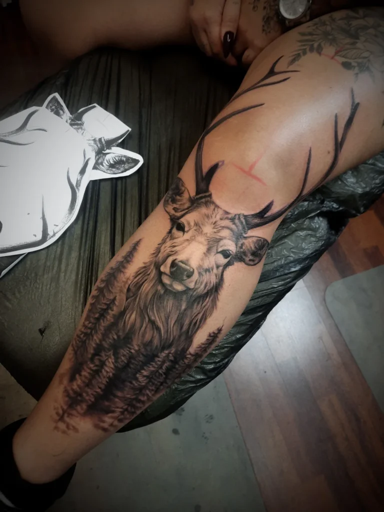 This striking tattoo showcases the regal head of a stag emerging from a backdrop of dark forest pines. The lifelike shading on the animal blends seamlessly into the vertical silhouettes of the trees, creating a powerful fusion of animal and nature. Its placement on the leg gives the tattoo a bold, vertical composition.