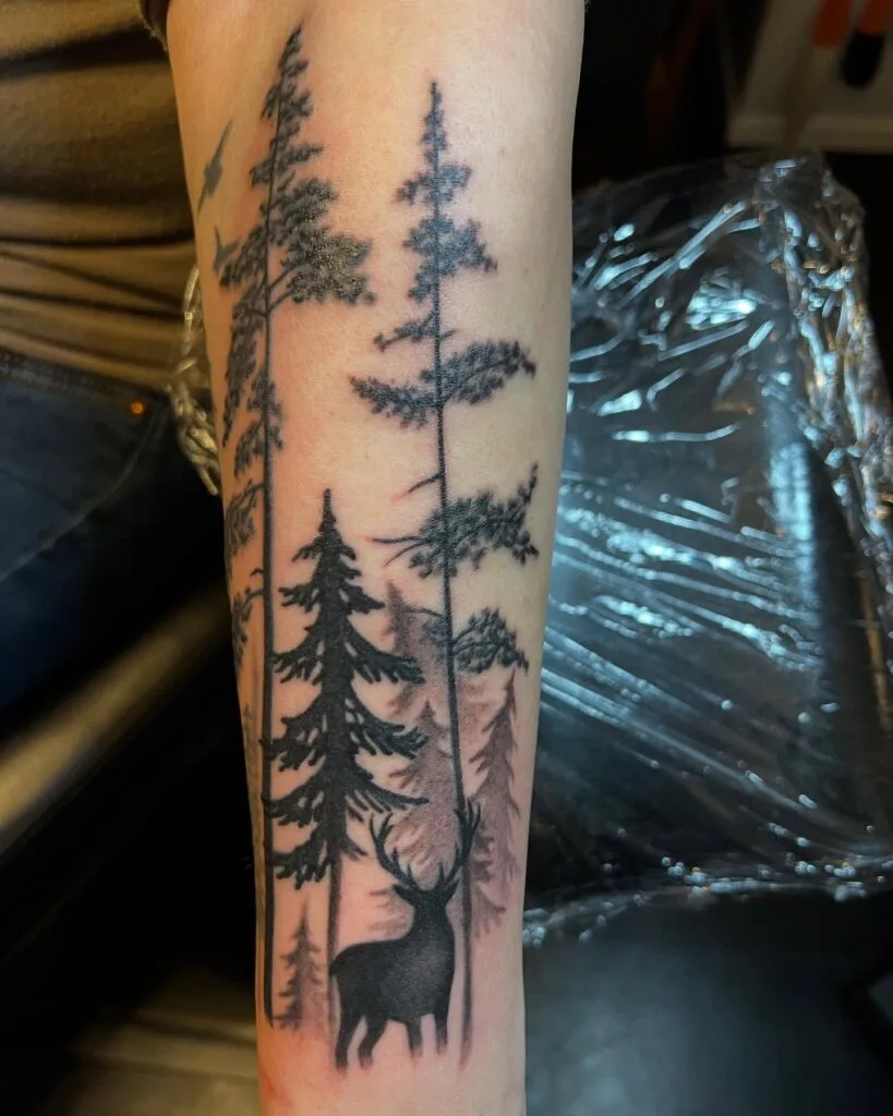 This tattoo depicts a serene deer standing among tall pine trees, blending into the landscape as if part of the forest itself. The black ink shading adds depth and mystery, while the placement on the forearm gives it a visible yet elegant presence.