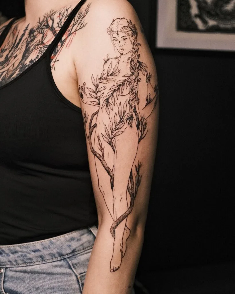 This tattoo beautifully blends the feminine form with forest elements, portraying a woman entwined with branches and leaves. The delicate linework creates a balance between elegance and strength, making her appear as a goddess or spirit of the woods. Its placement on the arm transforms the limb into a living canvas.