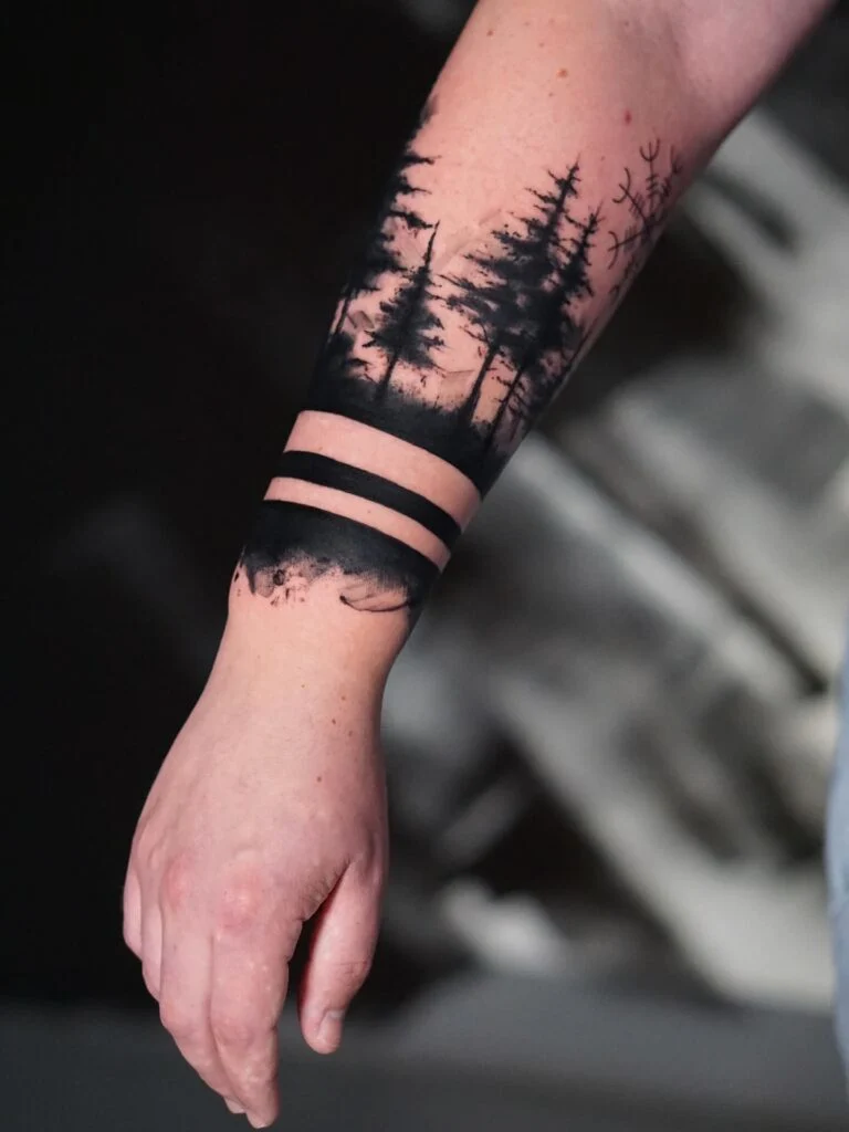 This tattoo creates a striking effect with bold black ink forming a band across the forearm, merging into silhouettes of tall pine trees. The contrast between the solid armband and the detailed forest imagery creates a captivating balance between minimalism and complexity.