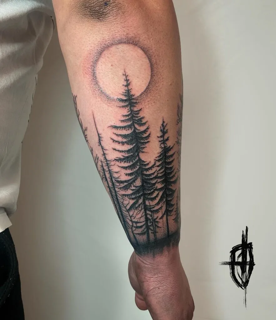 This tattoo displays a breathtaking forest scene with towering pines reaching toward a glowing circular moon. The soft shading around the moon contrasts beautifully with the dark trees, giving the design depth and ethereal charm. Positioned on the forearm, it elongates naturally with the arm’s contours.
