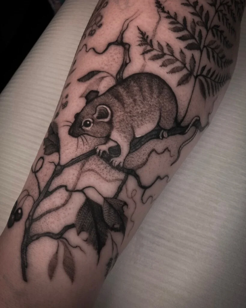 This tattoo features a delicate forest scene with a small woodland rodent perched on branches surrounded by leaves and ferns. The intricate linework and dot shading bring a realistic, almost storybook-like quality to the piece. Its placement on the arm makes it appear as though the creature is part of a living forest.
