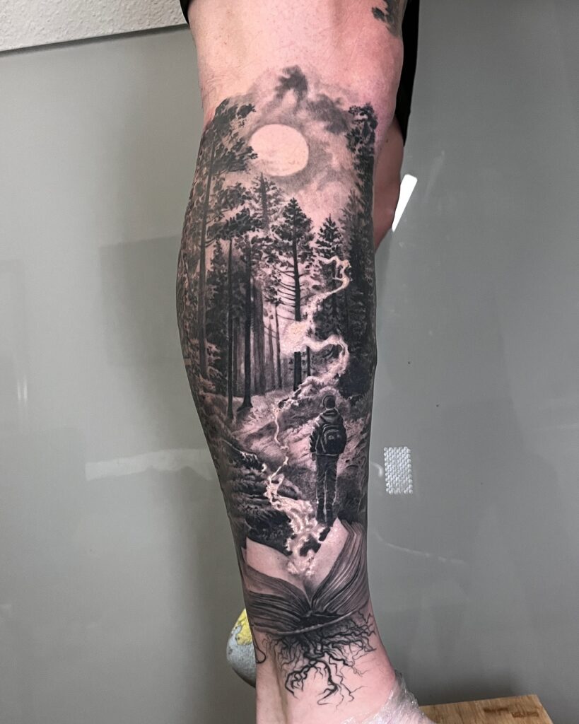 This highly detailed tattoo tells a story: a figure with a backpack walking along a winding path under towering pines, illuminated by a glowing moon. The design flows from the roots of an open book at the bottom, suggesting that the journey emerges from the pages of a story.