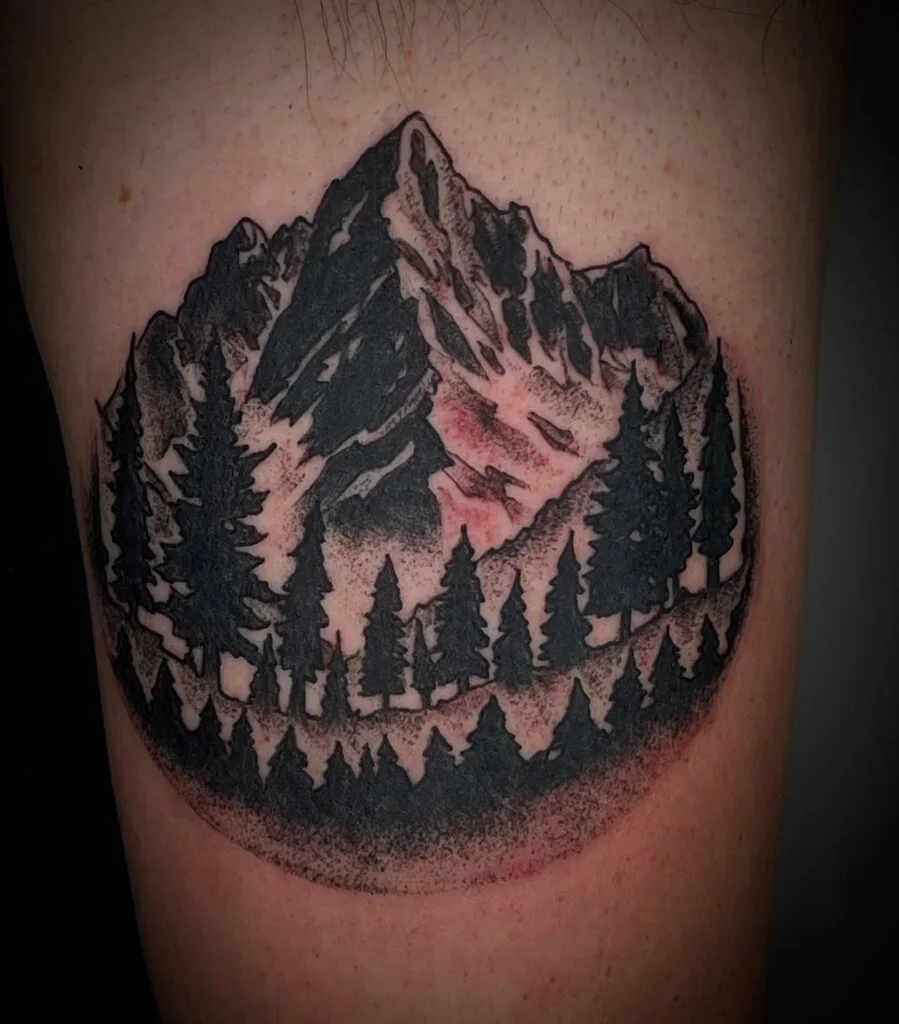 This circular tattoo merges a towering mountain with dense pine trees encircling its base. The strong blackwork and stippling create a bold yet balanced design, with fine details in the peaks giving it a sense of rugged realism. Its symmetry and contained shape make it an eye-catching and compact piece.