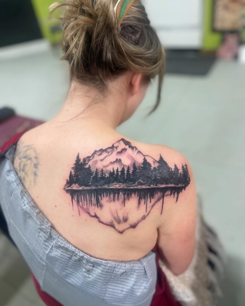 This tattoo captures the breathtaking beauty of nature with towering mountains mirrored against a tranquil forest lake. The crisp black shading creates a striking reflection effect that makes the scene look almost like a dream suspended on the skin. Placed on the back, it stretches naturally across the shoulder blade, giving the artwork room to breathe and flow.