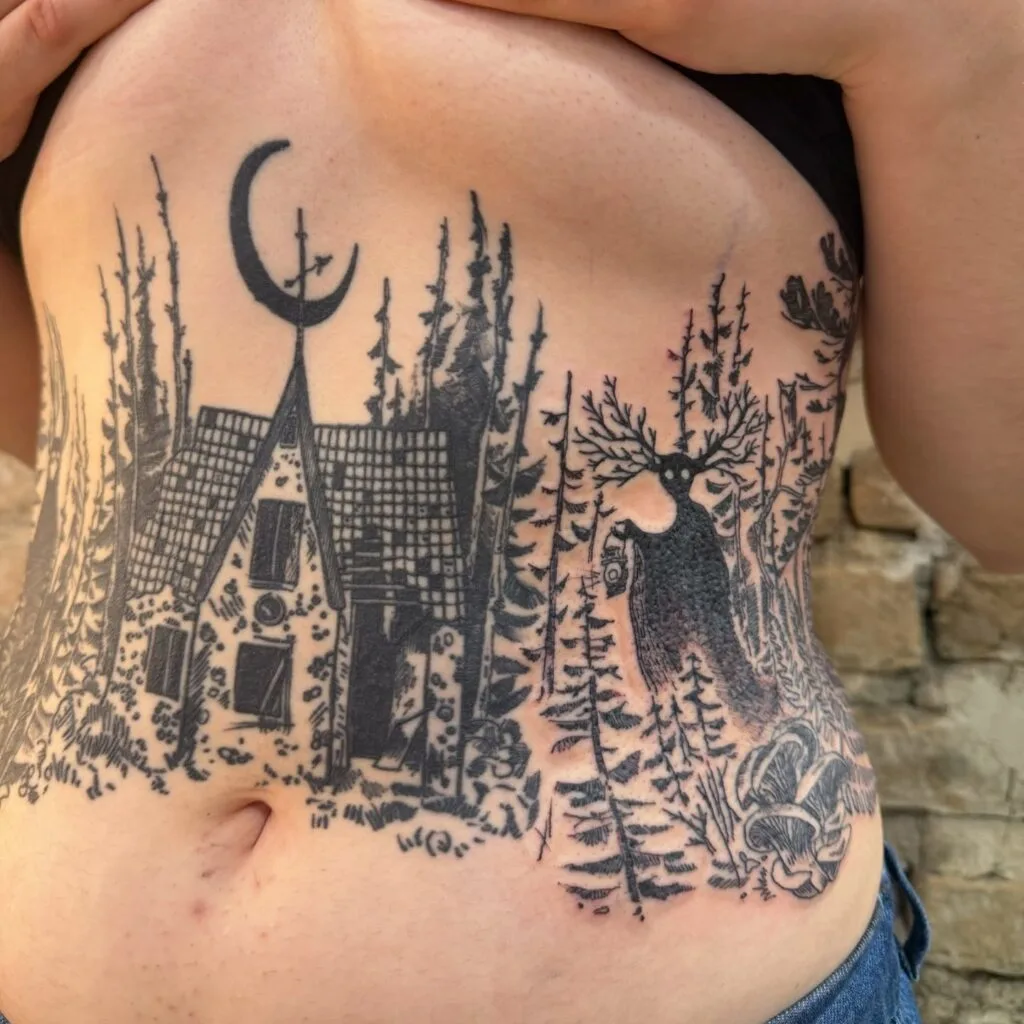 This tattoo features a mystical woodland cabin crowned by a crescent moon and framed by towering pines. The intricate details of the roof tiles, windows, and surrounding mushrooms bring the scene to life, while a mysterious stag-like spirit figure hides among the trees, carrying an eerie lantern.