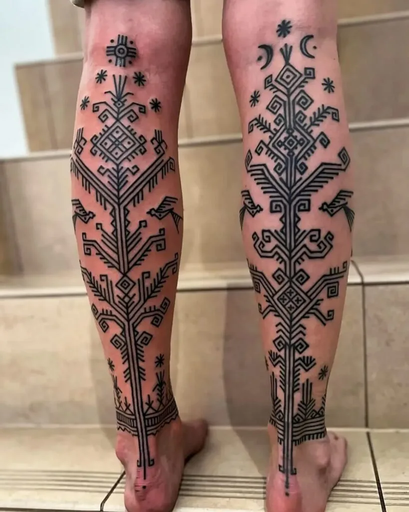 These symmetrical tattoos extend along the calves, creating striking tree-like patterns made from bold linear and angular shapes. The inclusion of stars, moons, and intricate diamond motifs adds a spiritual dimension, symbolizing balance, grounding, and connection to natural cycles.