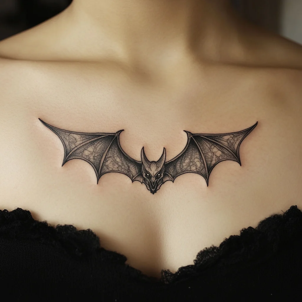 Bats are iconic gothic symbols representing mystery, rebirth, and nocturnal beauty. A bat-wing sternum tattoo is both edgy and elegant.