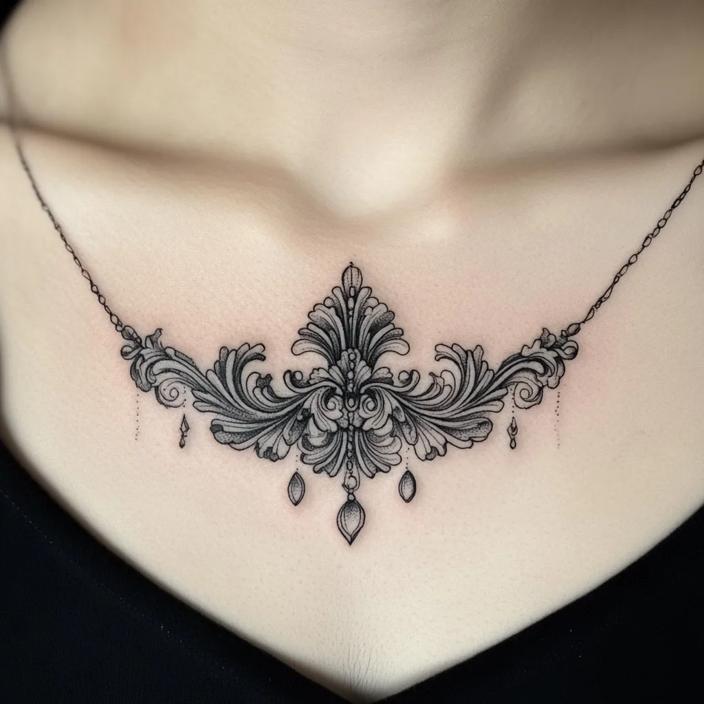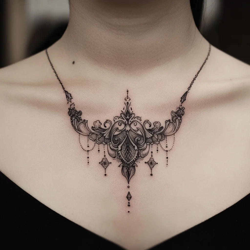 Center Sternum: This is the most common placement—directly between the breasts or across the breastbone. It’s ideal for symmetrical designs like gothic crosses, stained glass patterns, or baroque shapes.