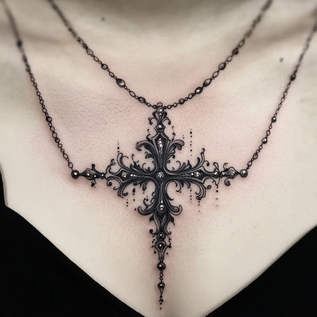 A gothic cross with draping chains and rosary beads makes for an incredibly powerful sternum tattoo.