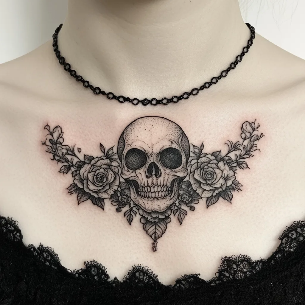 6. Skull and Roses Gothic Sternum Tattoo