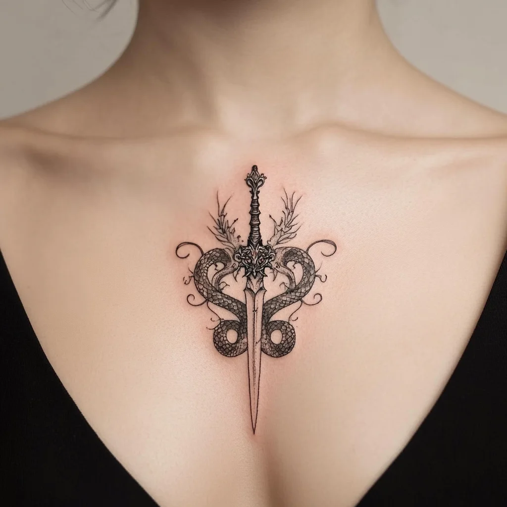 9. Dagger and Serpent Gothic Sternum Tattoo