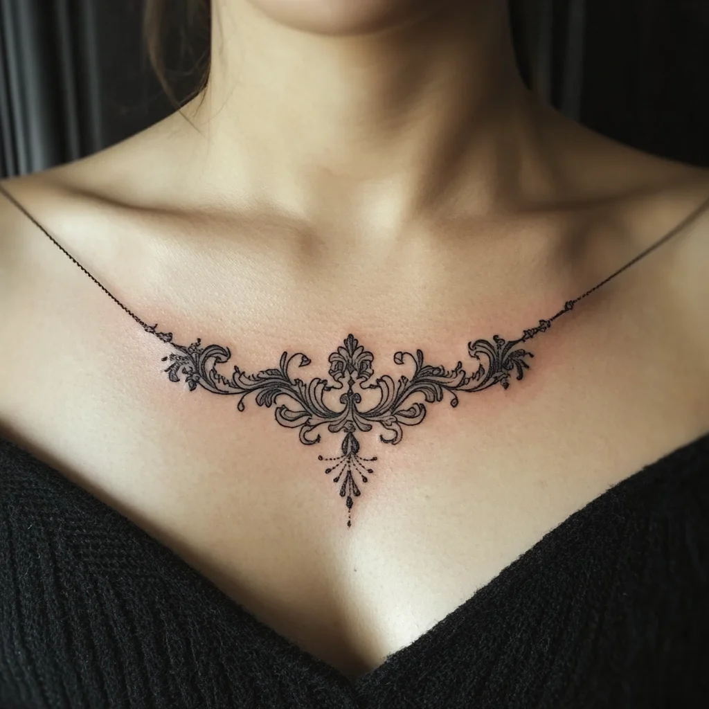 Center Sternum: This is the most common placement—directly between the breasts or across the breastbone. It’s ideal for symmetrical designs like gothic crosses, stained glass patterns, or baroque shapes.