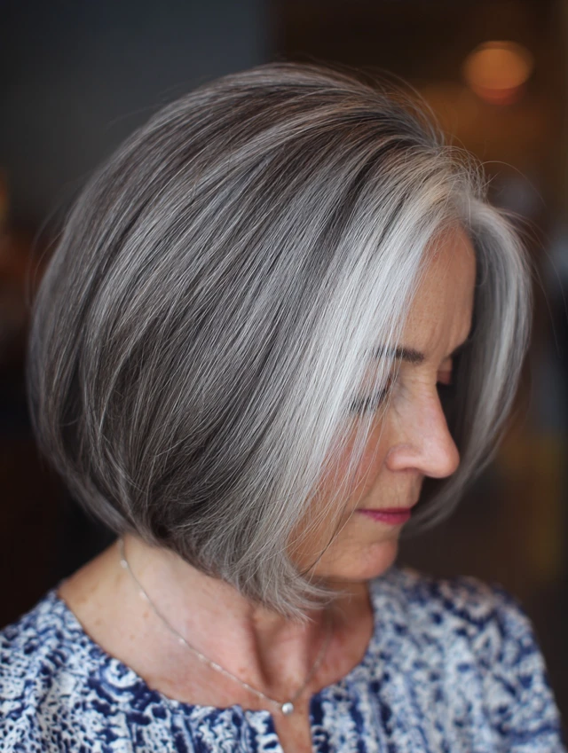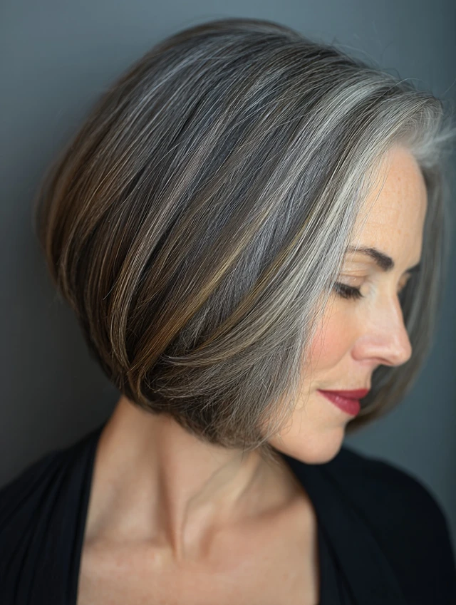 A sleek bob highlights the contrast between gray hair and ash brown lowlights for a modern, sophisticated look.