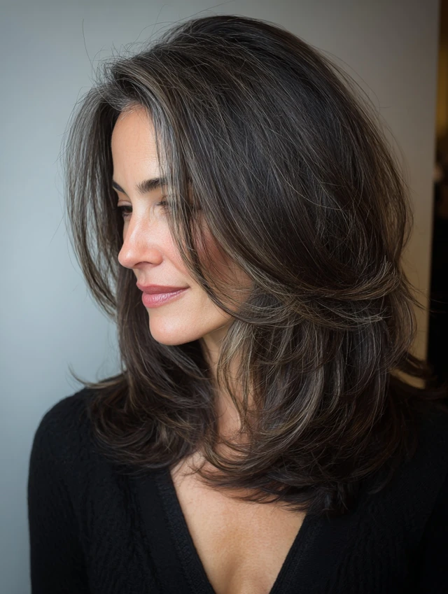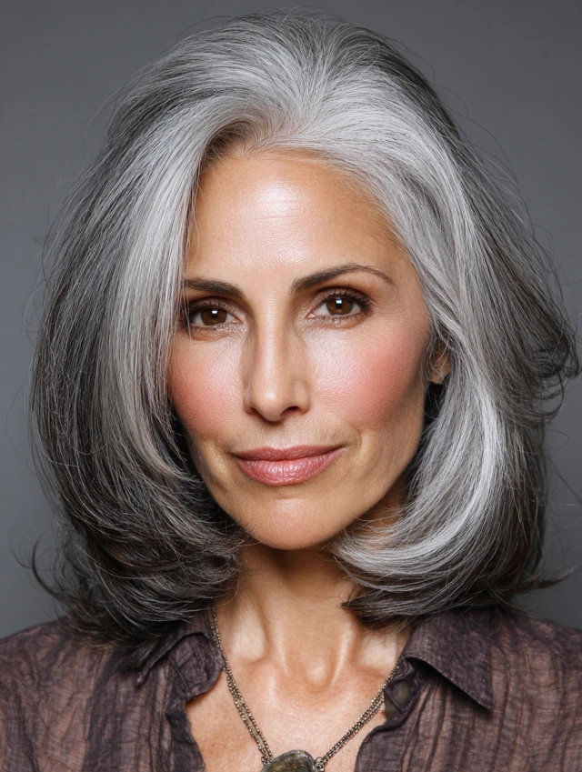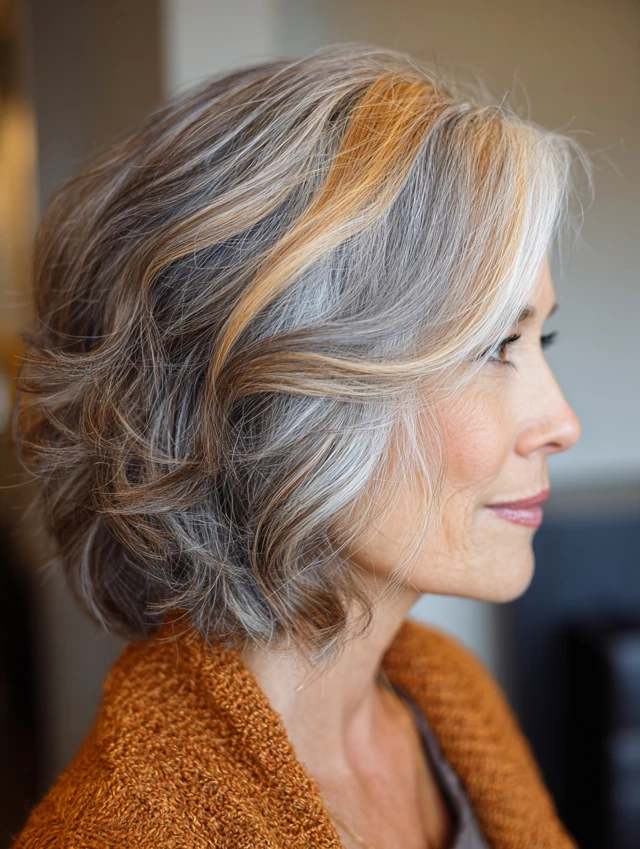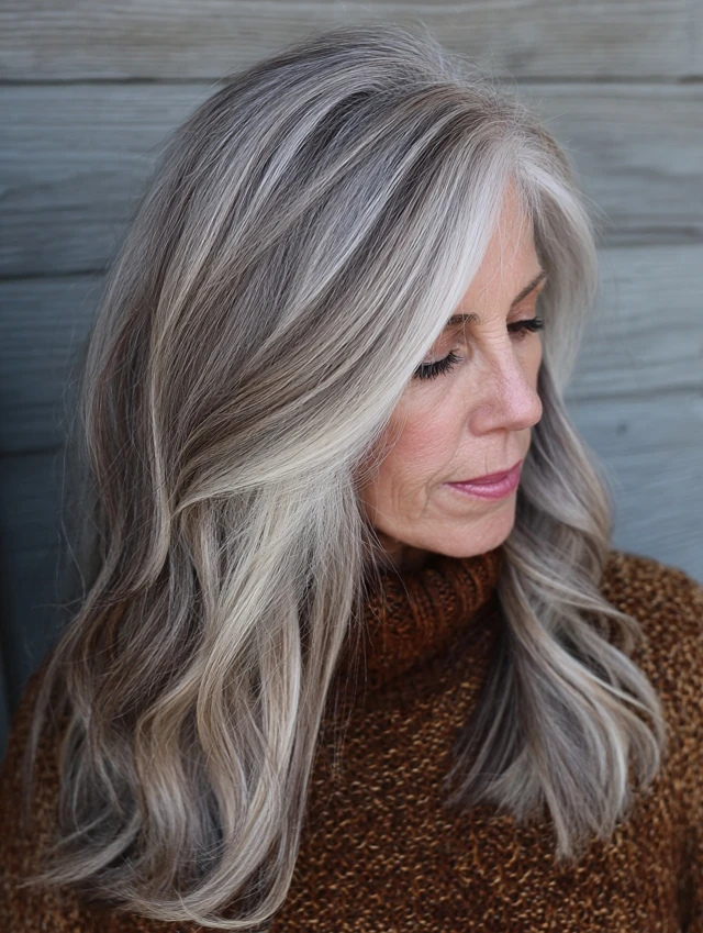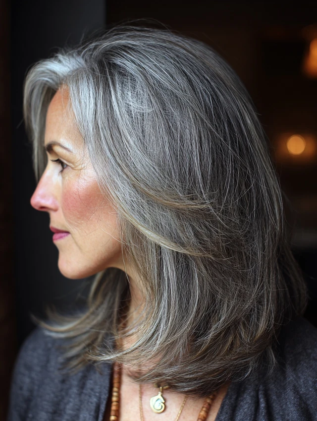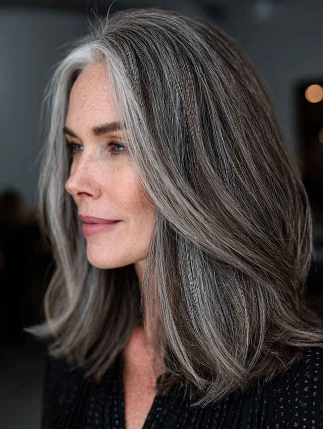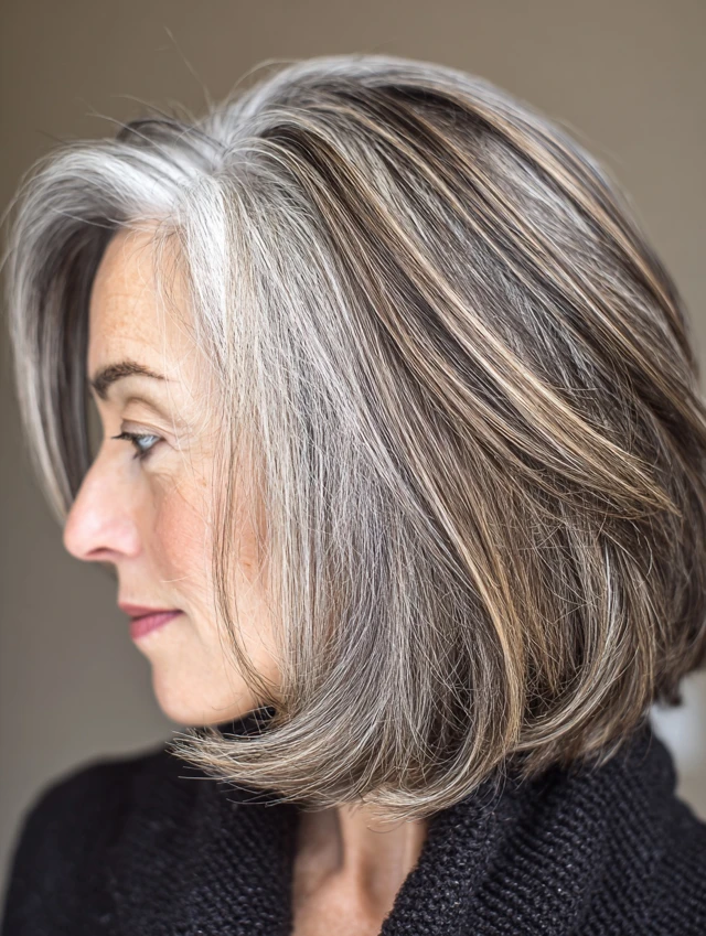 Confidence completes the look—own your gray hair with lowlights and let it radiate sophistication.