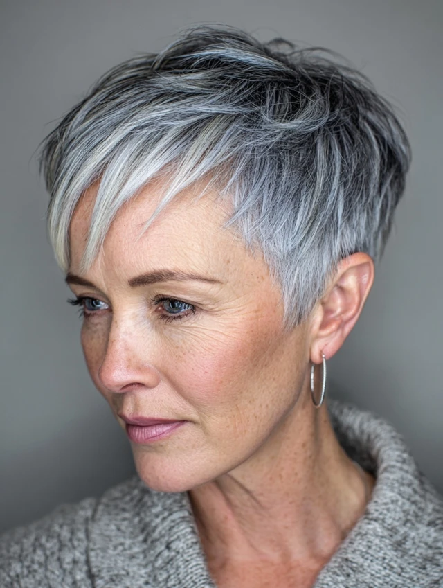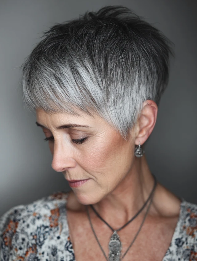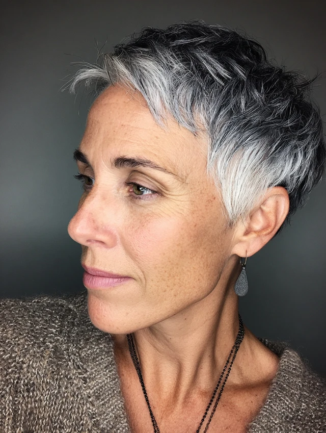 A pixie cut with subtle charcoal lowlights adds texture and depth, making gray hair appear stylish and contemporary.