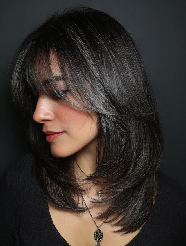 1. Shoulder-Length Layers with Charcoal Lowlights