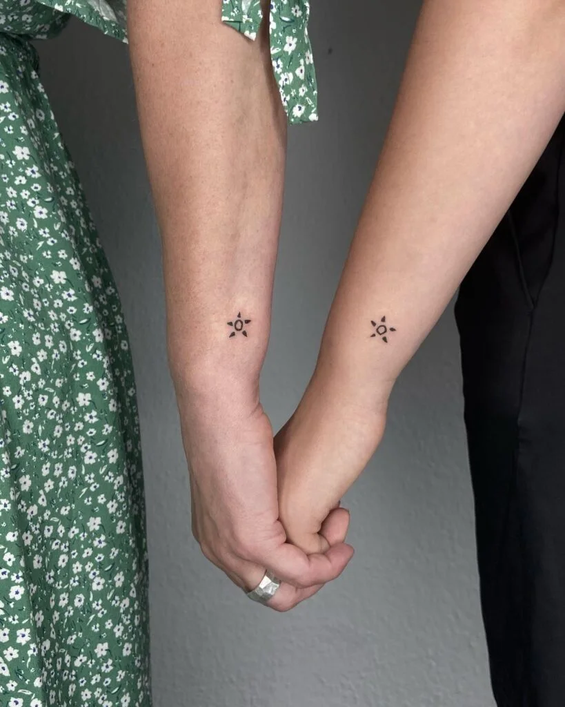 These minimalist hand-poked tattoos depict tiny sun-like designs inked on the forearms of two people holding hands. Their matching placement highlights connection, partnership, and shared journeys, making them perfect friendship or couple tattoos. The simple black lines radiate outward like beams of light, symbolizing warmth, guidance, and renewal.