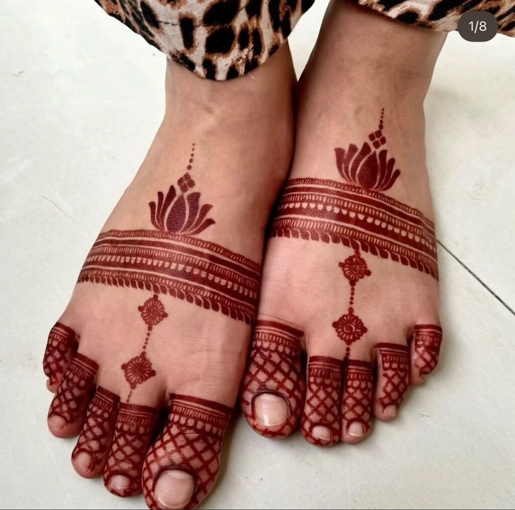 This foot henna design combines classic motifs with bold lotus accents. The toes are decorated with netted patterns, while the ankle area carries horizontal borders and floral chains that flow seamlessly into the central design. The lotus flower adds a spiritual and symbolic element of purity and strength.