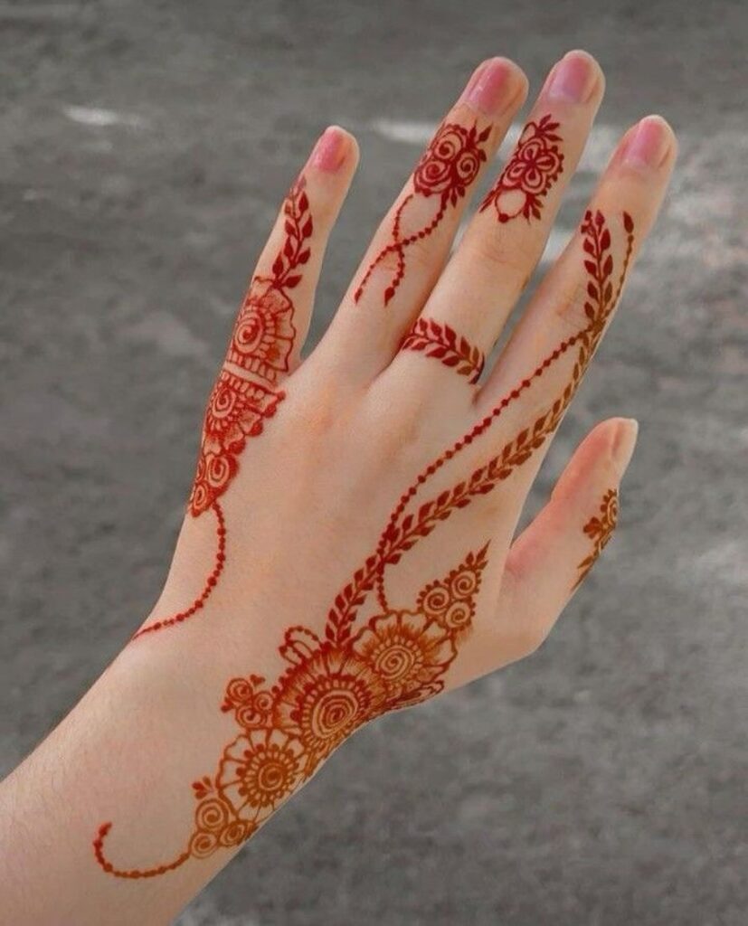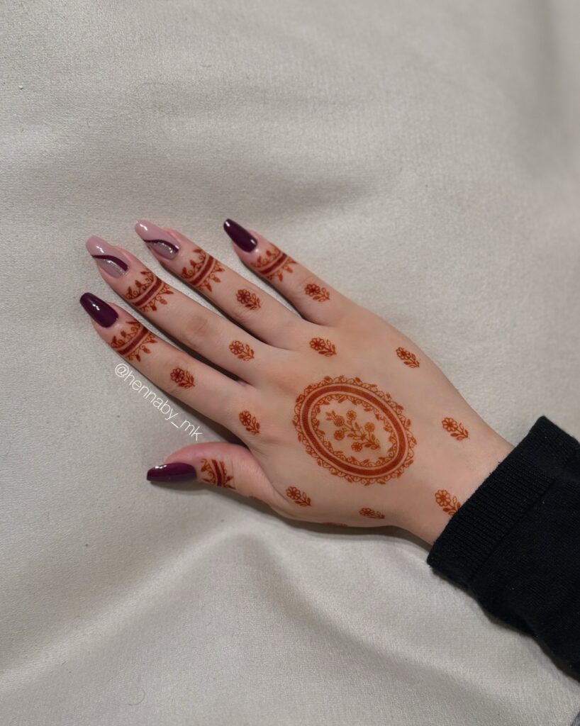 - Mandala-inspired henna: Represents balance, harmony, and spirituality.