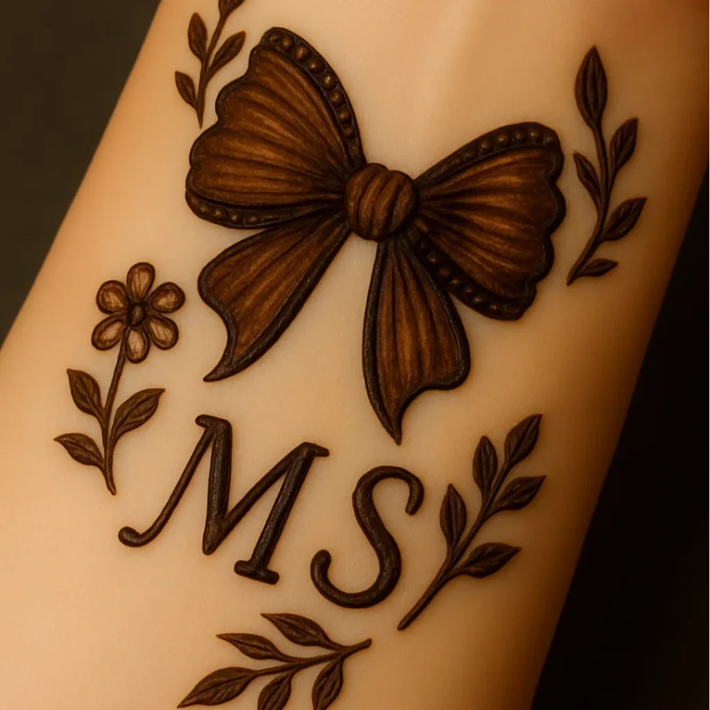 This unique henna tattoo highlights a bold bow surrounded by leafy accents, a floral element, and personalized initials “MS.” The bow is crafted with textured detail, giving it a dimensional look that sets it apart from traditional designs.