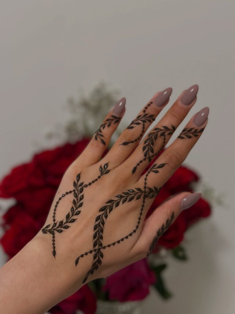 The placement makes it unique, highlighting the hand’s natural curves. Perfect for casual wear, festive events, or even as a minimalist bridal choice, this henna tattoo blends elegance with sophistication, making it a versatile option for women of all styles.