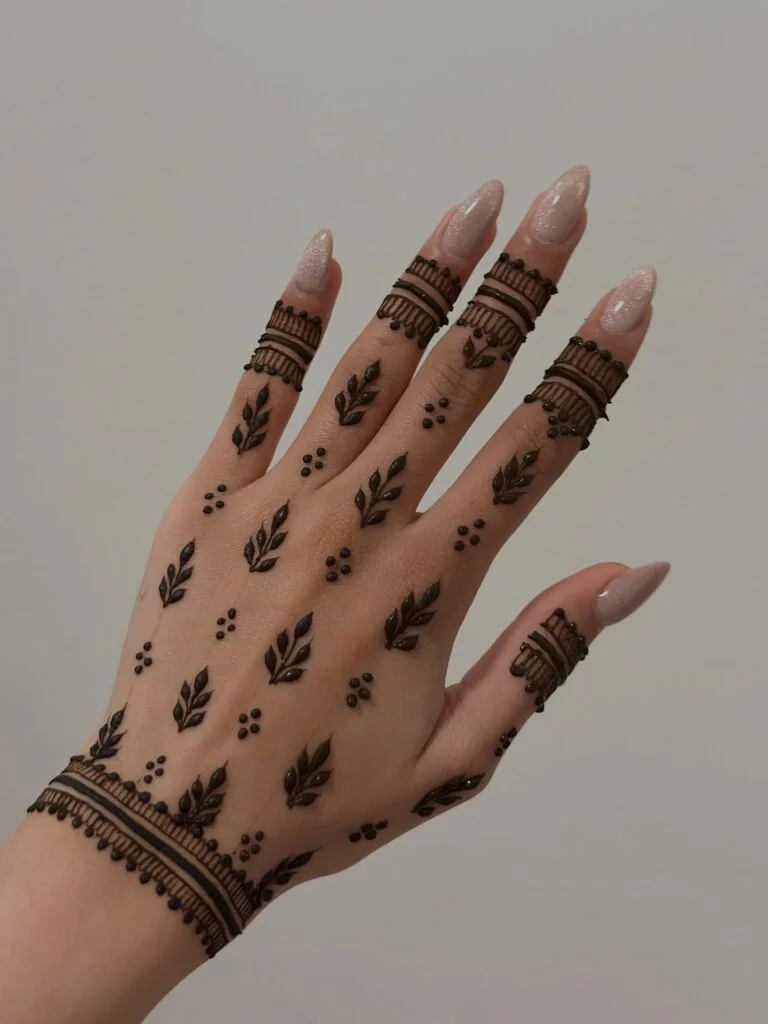 This henna tattoo features tiny leafy clusters and dotted accents, beautifully arranged across the hand and fingers. The linear details on the fingers mimic rings, giving the impression of natural jewelry. Its minimal approach makes it versatile, subtle, and stylish without overwhelming the skin.