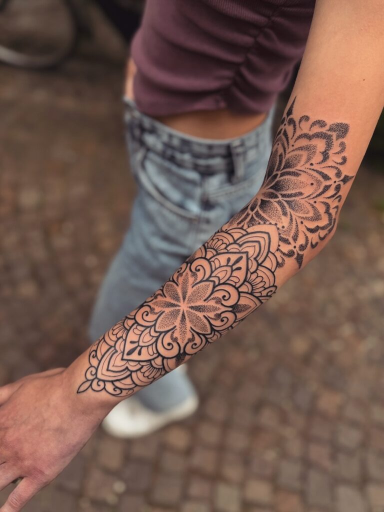 This stunning henna design covers the forearm with a bold mandala-inspired sleeve. The intricate floral layers and dotted shading create depth, giving it the appearance of a permanent tattoo while still maintaining henna’s natural charm. The symmetry and precision make it both eye-catching and artistic.