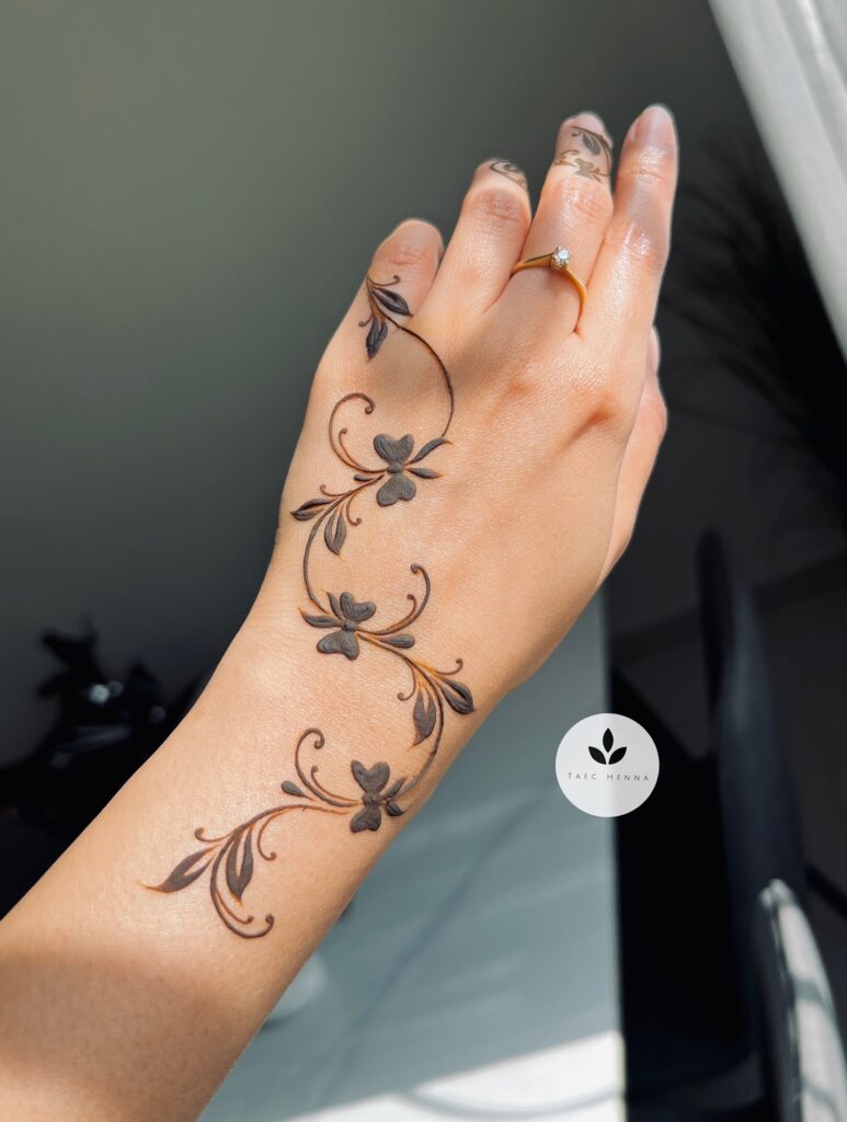 The design is ideal for women who prefer minimal yet classy henna tattoos. It complements accessories like rings and bracelets while adding a charming touch to everyday or special looks. A timeless choice that balances tradition and modern style beautifully.