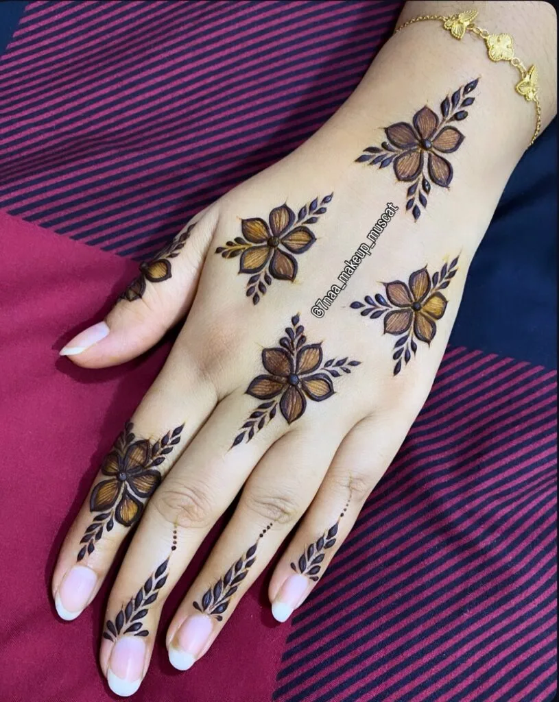 The design is ideal for women who prefer minimal yet classy henna tattoos. It complements accessories like rings and bracelets while adding a charming touch to everyday or special looks. A timeless choice that balances tradition and modern style beautifully.