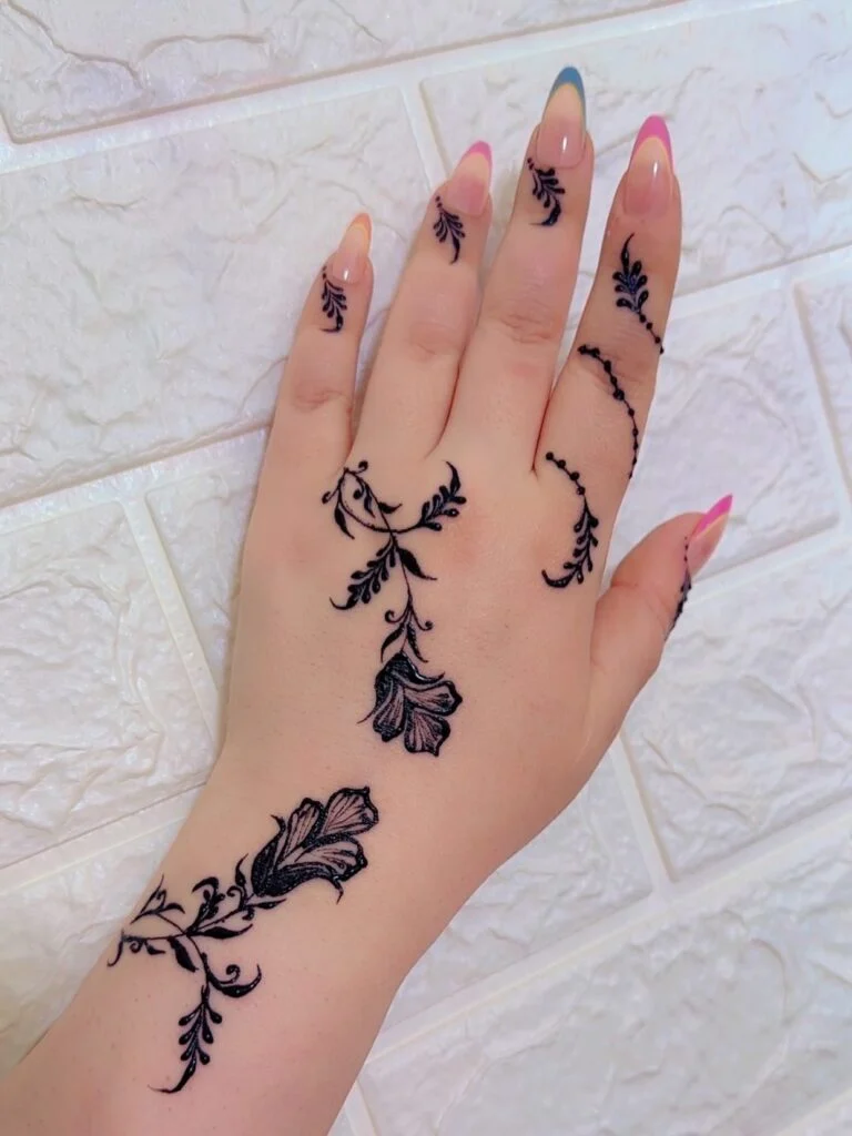 This henna tattoo features tiny leafy clusters and dotted accents, beautifully arranged across the hand and fingers. The linear details on the fingers mimic rings, giving the impression of natural jewelry. Its minimal approach makes it versatile, subtle, and stylish without overwhelming the skin.