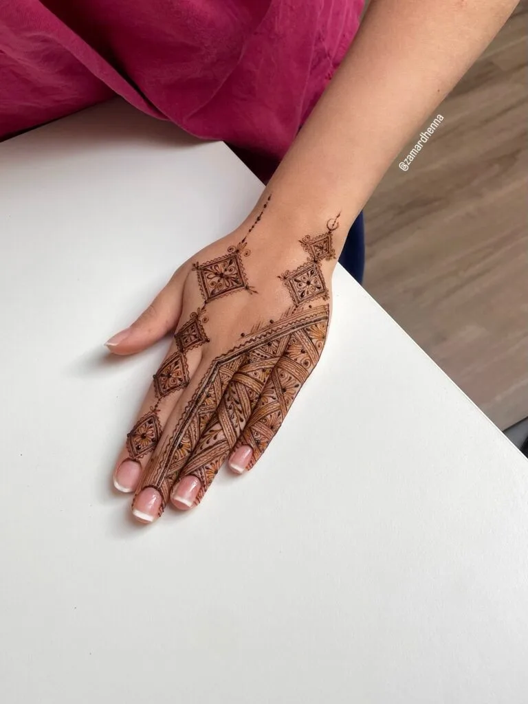 This striking henna tattoo blends geometric symmetry with traditional motifs, forming square and diamond patterns across the hand. The combination of lines, floral accents, and fine detailing reflects Moroccan-inspired artistry.