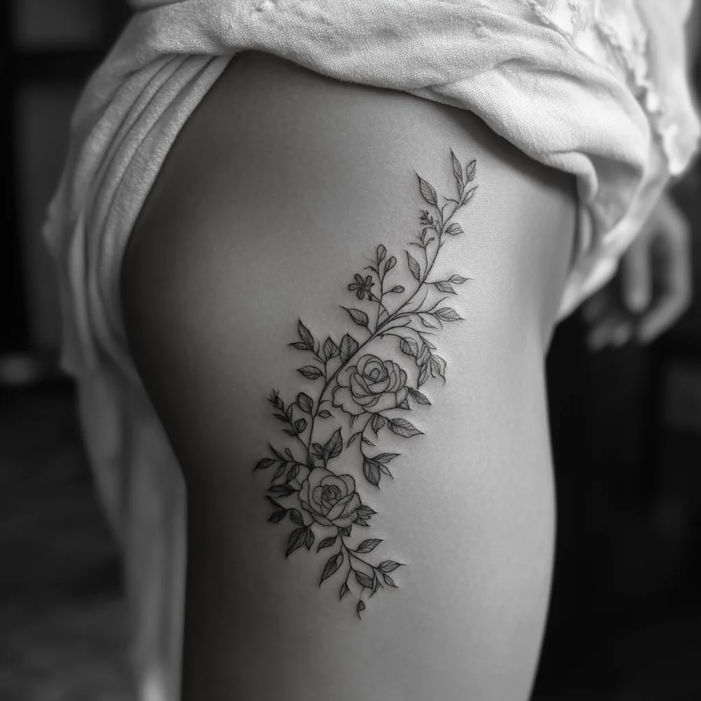 A floral vine tattoo beautifully wraps around the hip bone, adding a touch of femininity and elegance. The design can feature roses, cherry blossoms, or wildflowers, each carrying unique symbolism. Roses represent love and passion, while cherry blossoms signify the fleeting nature of life. Wildflowers, on the other hand, symbolize resilience and natural beauty. This type of tattoo follows the body’s natural curves, creating a flowing and graceful look. Whether done in black ink for a classic feel or with soft watercolor shading for a delicate touch, a floral vine tattoo is a timeless and sophisticated choice.