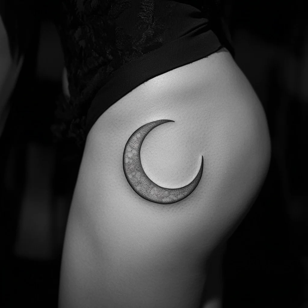 A crescent moon tattoo near the hip bone is a subtle yet powerful choice, symbolizing mystery, intuition, and feminine energy. The moon has long been associated with cycles, transformation, and guidance, making it a perfect design for those who feel connected to celestial elements. This tattoo can be done as a simple, sleek outline or incorporate intricate details such as stars or clouds for added depth. Some choose to combine the moon with other celestial symbols, like constellations or planets, to create a personalized cosmic theme. A minimalist crescent moon is a timeless and elegant tattoo option.