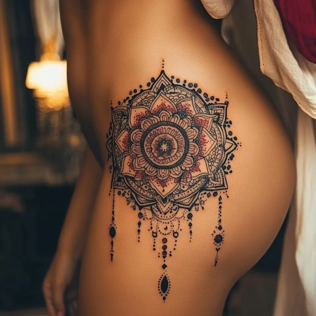 Ornamental lace and mandala tattoos have a delicate yet striking appeal, often following the natural curve of the hip and extending towards the thigh. These designs are heavily inspired by henna patterns and sacred geometry, creating a beautifully intricate look.